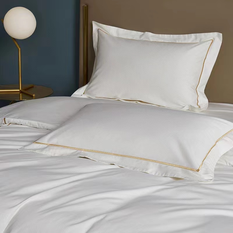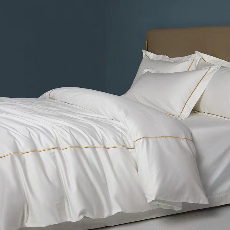 The Single Line Embroidery 100% Cotton White 300TC Bedding Sheet Set Duvet Cover includes a complete and comfortable bedding set: fitted sheet, flat sheet, duvet cover, and pillowcases. Available in various sizes (3, 4, 6, or 8 pieces), this set offers flexibility to meet different needs and room sizes. 300TC is suitable for commercial use, such as hotels, where frequent washing is required to ensure the sheets retain their elasticity, resist pilling, and maintain a fresh, clean appearance. This durable set is a cost-effective, long-term investment for any hospitality business.
